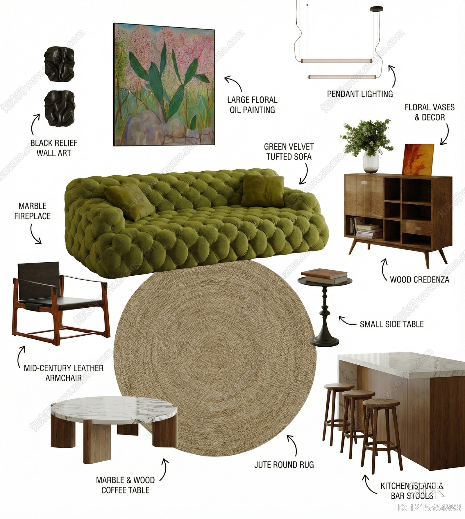 中古风客餐厅 轻法式客厅软装 布艺沙发 茶几 休闲椅 实木边柜