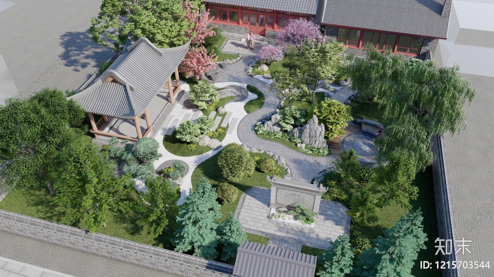 - 新中式别墅庭院 中式庭院 连廊 凉亭 假山流水 植物组合