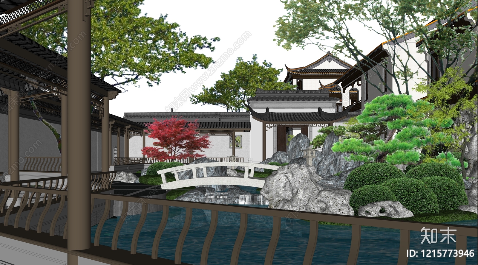 - 新中式别墅庭院 中式庭院 连廊 凉亭 假山流水 植物组合