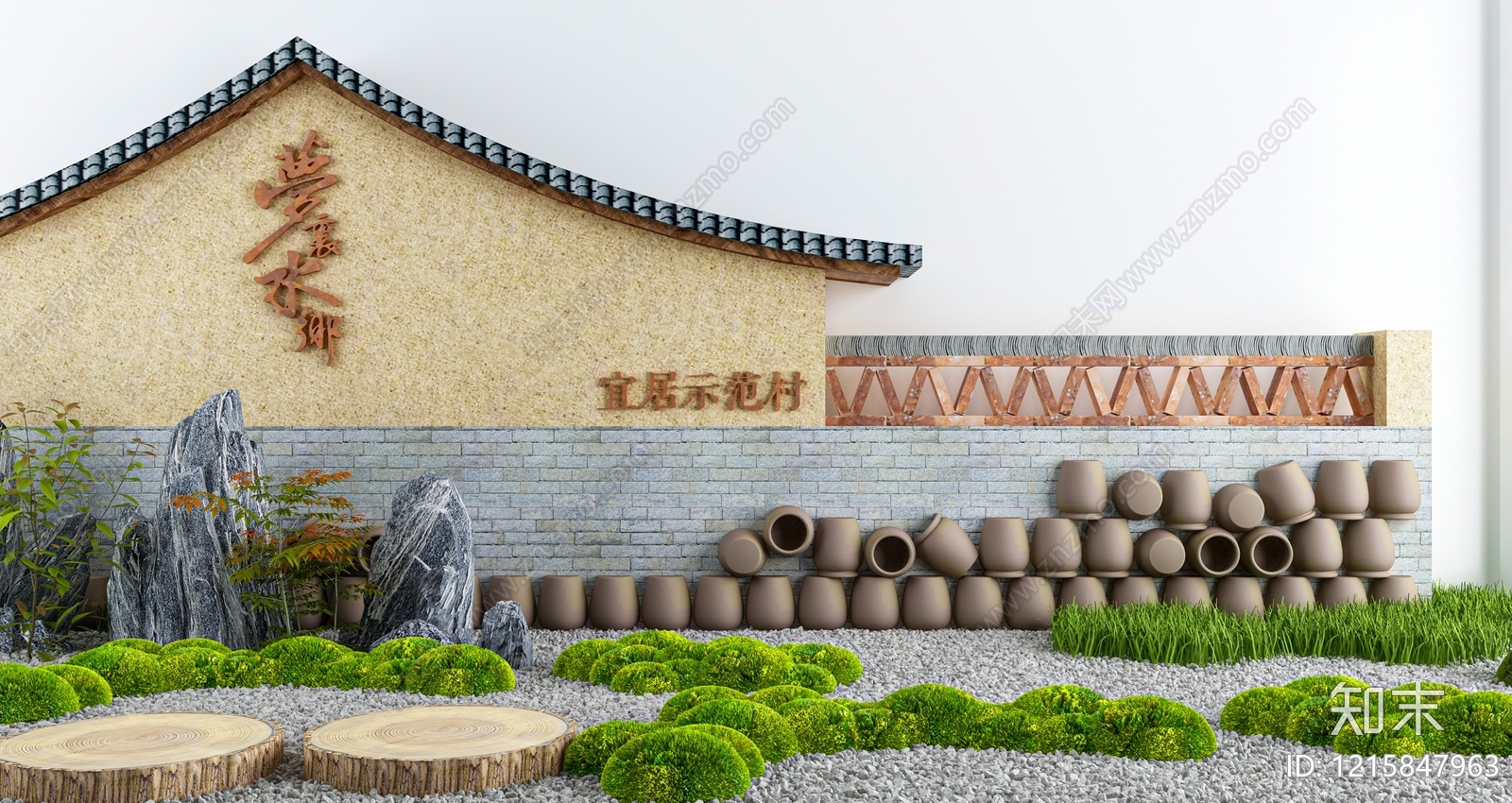 - 新中式景墙 新中式陶罐假山 假山庭院景墙 绿植院落庭院景观 民宿建筑山墙面 民宿花园景观