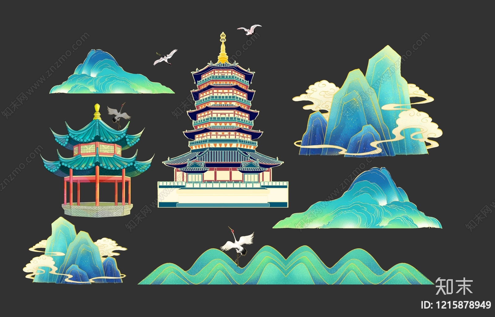 - 新中式国潮风影视 2D 国潮山水 亭台楼阁 青绿山水 手绘山水图案