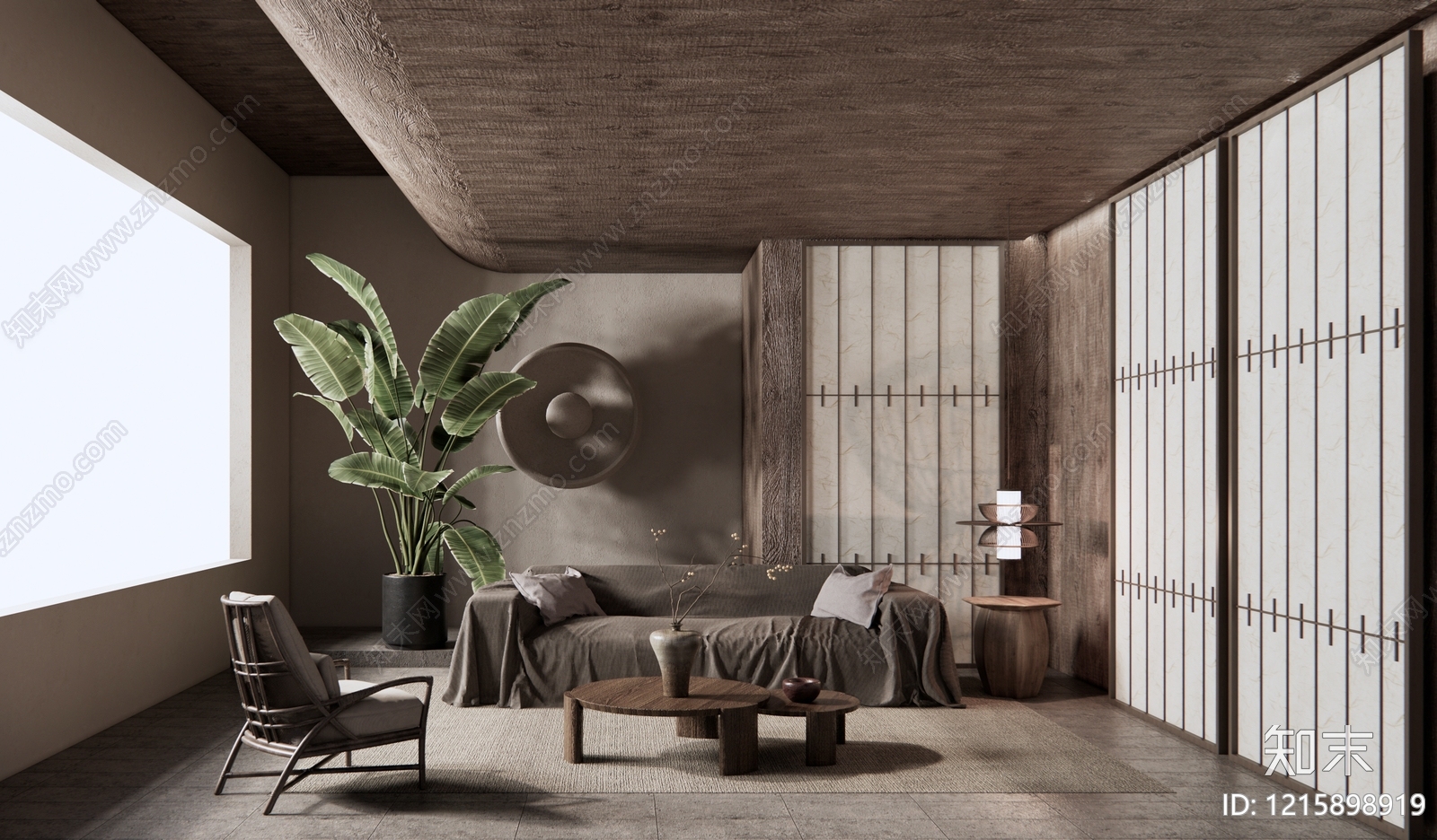 侘寂家居客厅 沙发茶几花艺 吊灯边几休闲椅 屏风植物盆栽