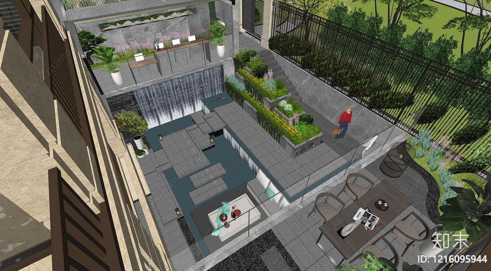 - 新中式景观别墅庭院 现代庭院 流水景墙 庭院门头 鱼池景观 庭院景墙