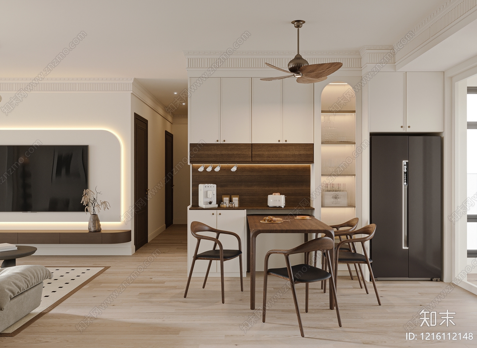 奶油风客餐厅 中古奶油风客餐厅 餐桌椅 餐边柜 吊扇灯 冰箱