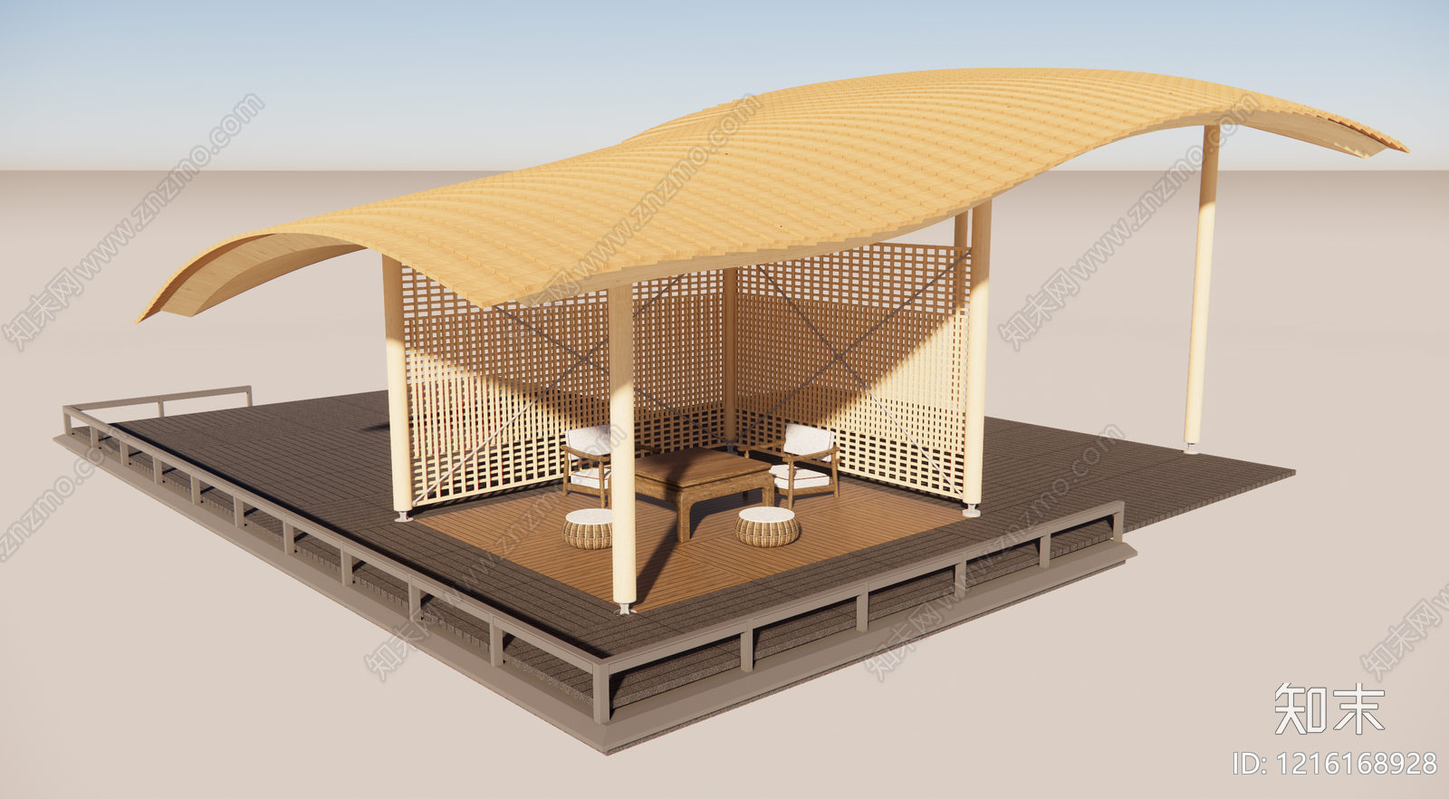新中式廊架 示范区休闲廊架 曲线屋面异形廊架 弧形屋面休憩廊架 竹编立面会客廊架 现代东方景观廊架
