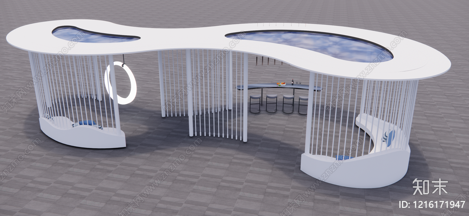 - 极简主义廊架 流线曲面景观廊架 白色极简异形廊架 环形吊椅社区廊架 度假酒店会客廊架 水滴状示范区廊架