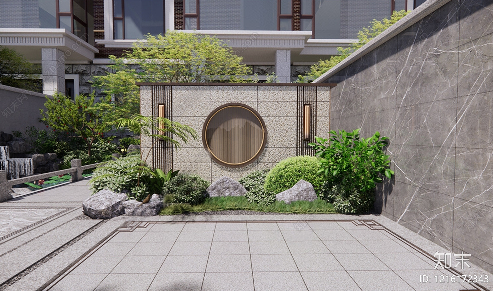 - 新中式别墅庭院 新中式景墙 庭院景观 别墅庭院