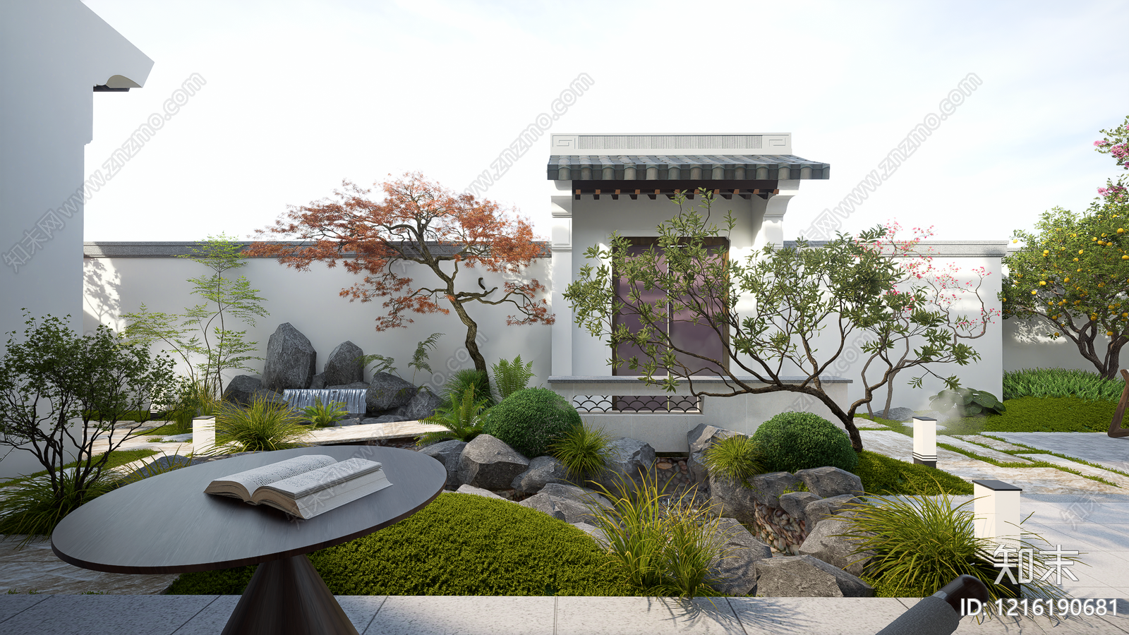 - 新中式景观别墅庭院 假山 假山水景 景墙