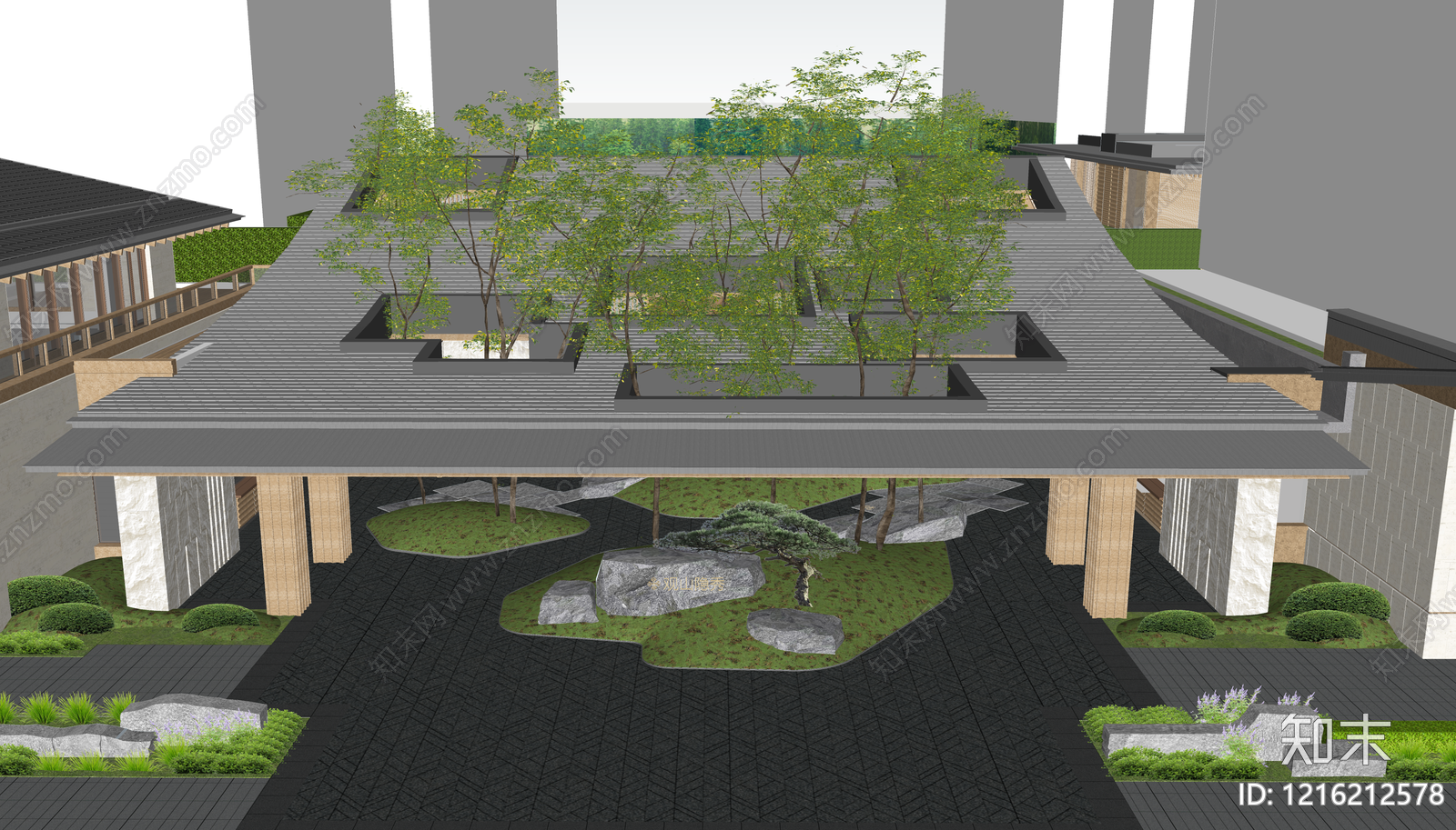 - 新中式景观小区景观 现代东方示范区 示范区水景中庭 山水庭院中庭空间 示范区连廊空间 大挑檐入口前场