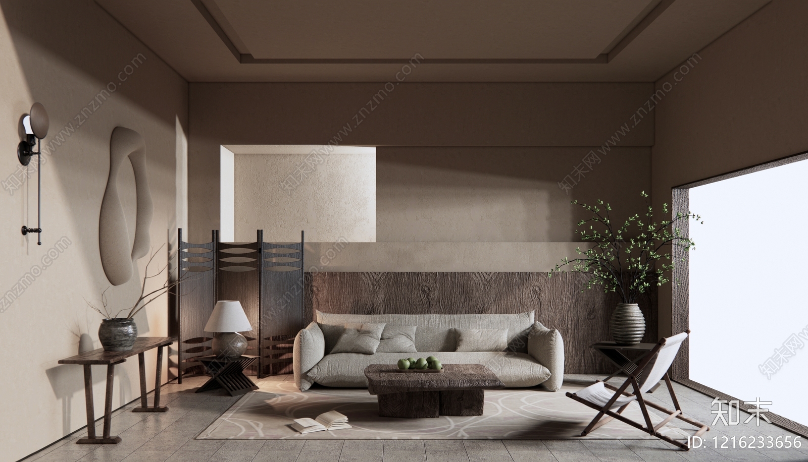 侘寂家居客厅 沙发茶几休闲椅 书籍植物花艺 水果屏风挂饰 壁灯边几台灯 长案摆件