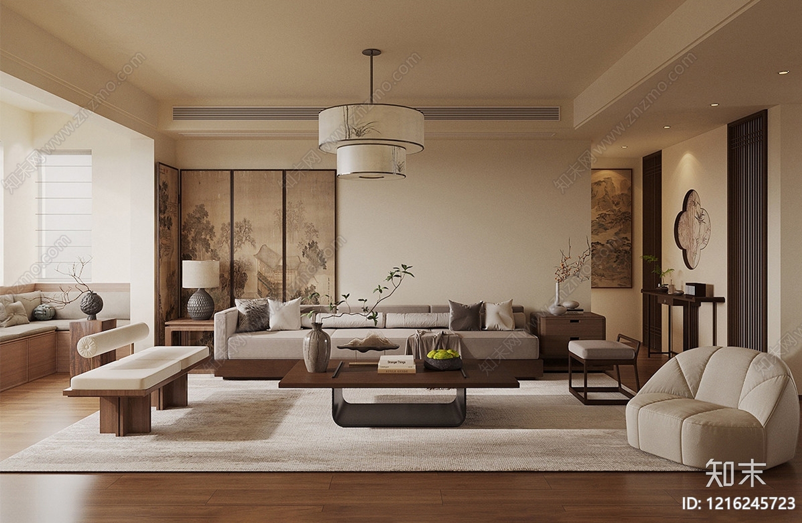 - 侘寂家居客厅 沙发茶几休闲椅 书籍植物花艺 水果屏风挂饰 壁灯边几台灯 长案摆件