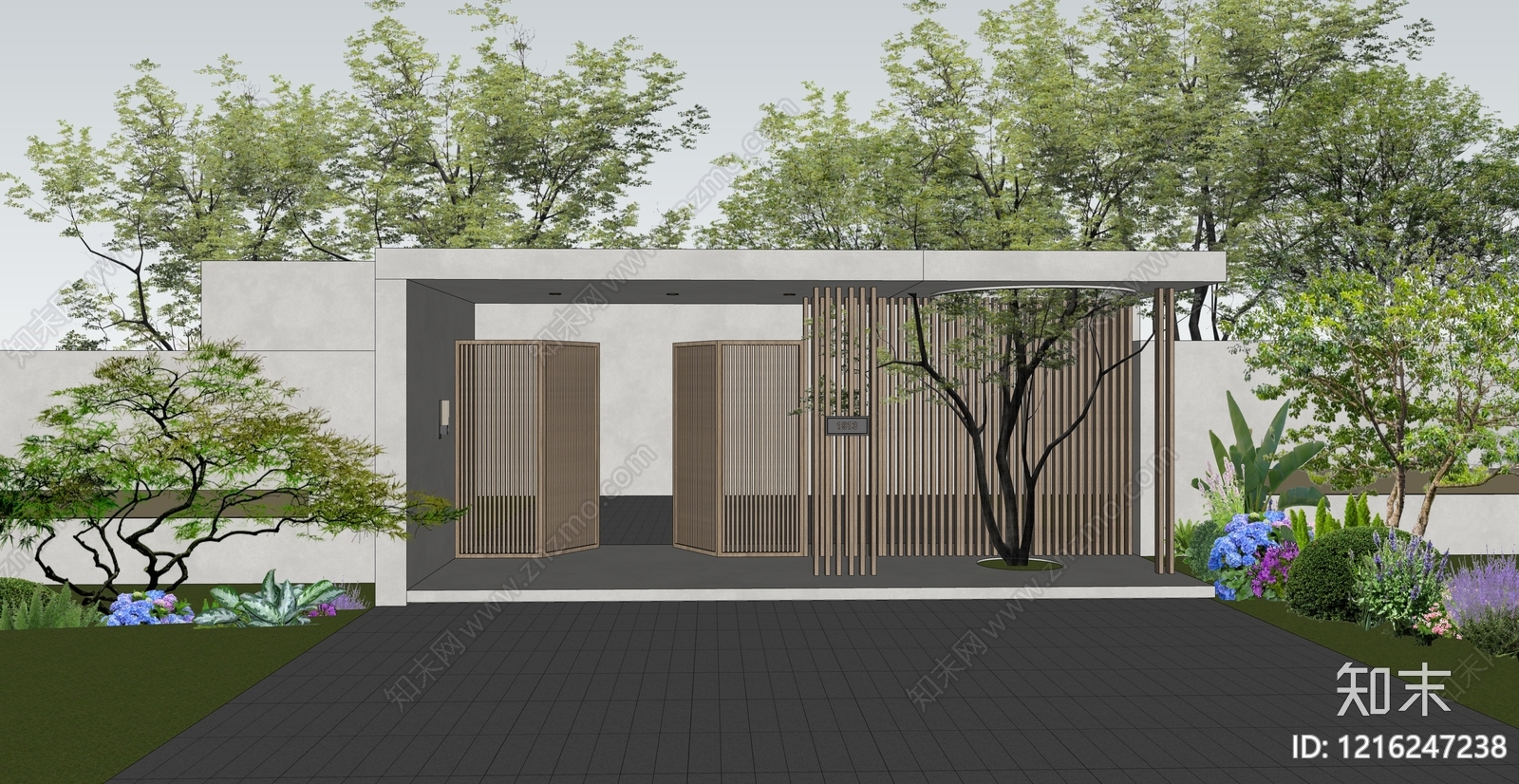 - 新中式入口大门 石材景墙绿植门口