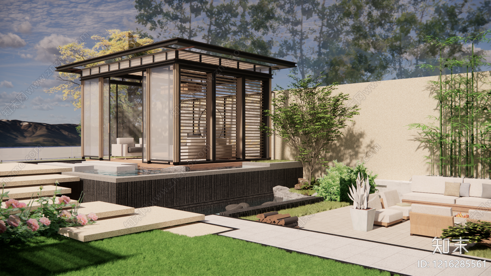 - 新中式别墅庭院 庭院景观 别墅花园 别墅庭院
