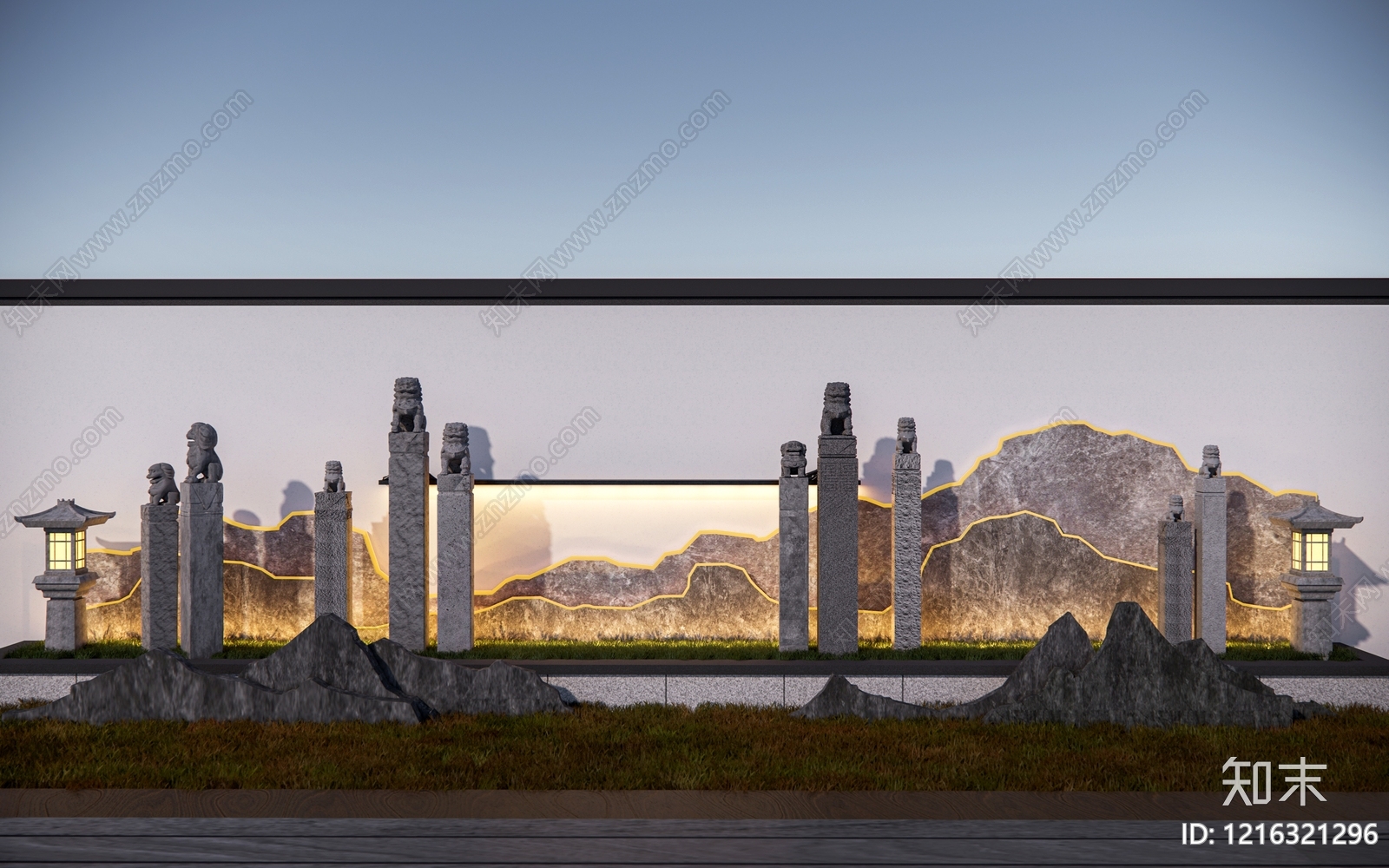 - 新中式景墙 中式景墙 座椅组合 灯具 石头 奢石景墙