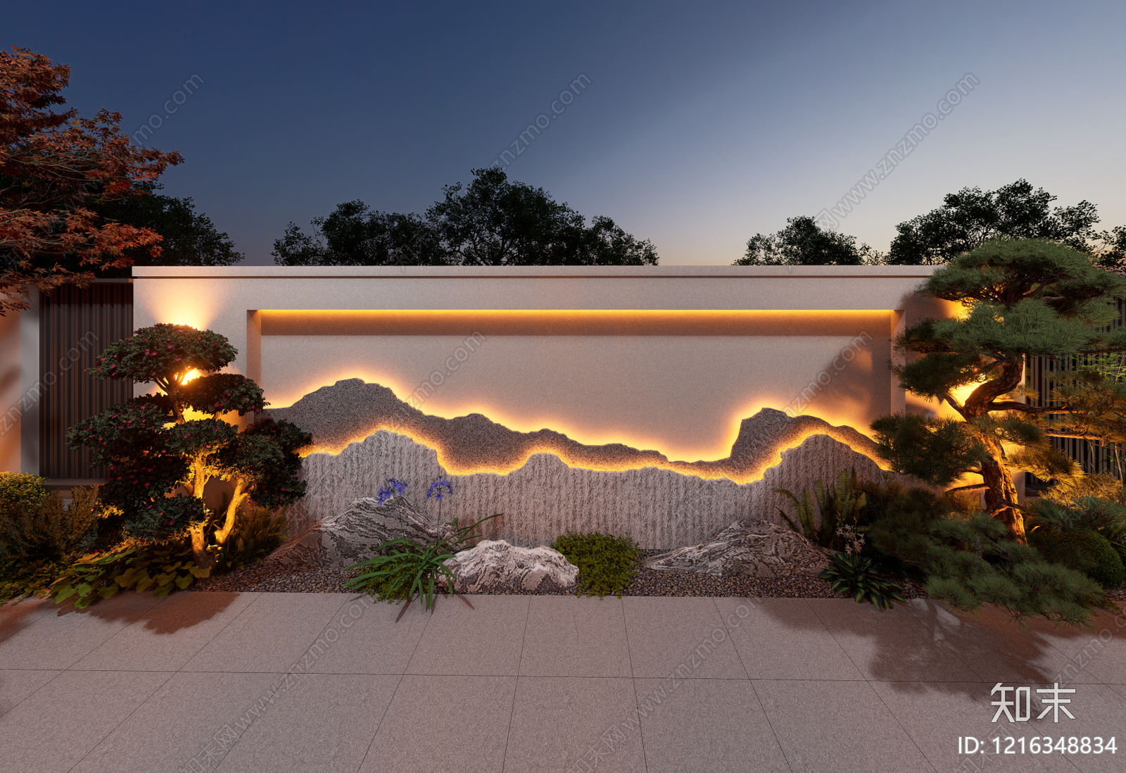 - 新中式景墙 中式景墙 座椅组合 灯具 石头 奢石景墙