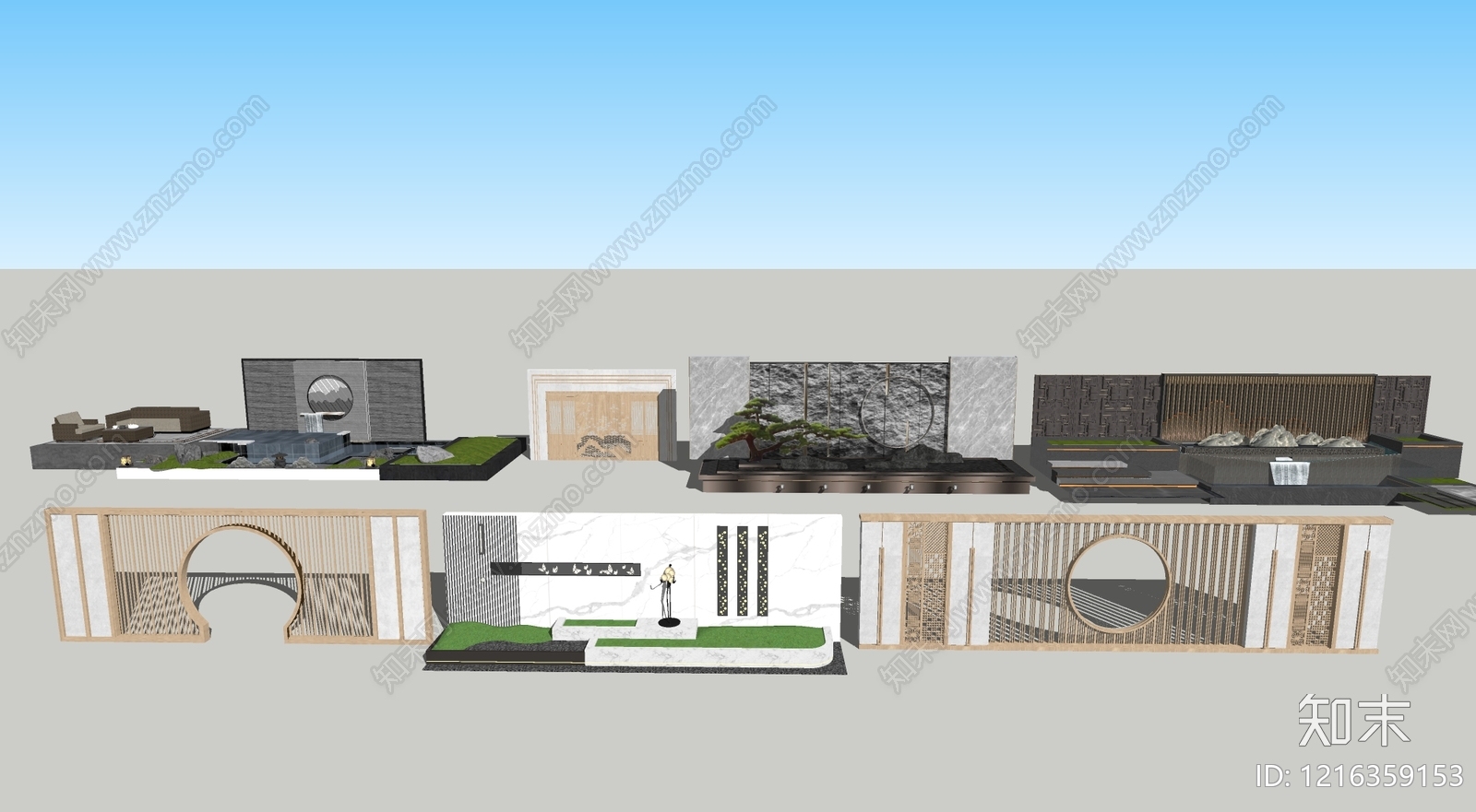 - 新中式景墙 中式景墙 座椅组合 灯具 石头 奢石景墙
