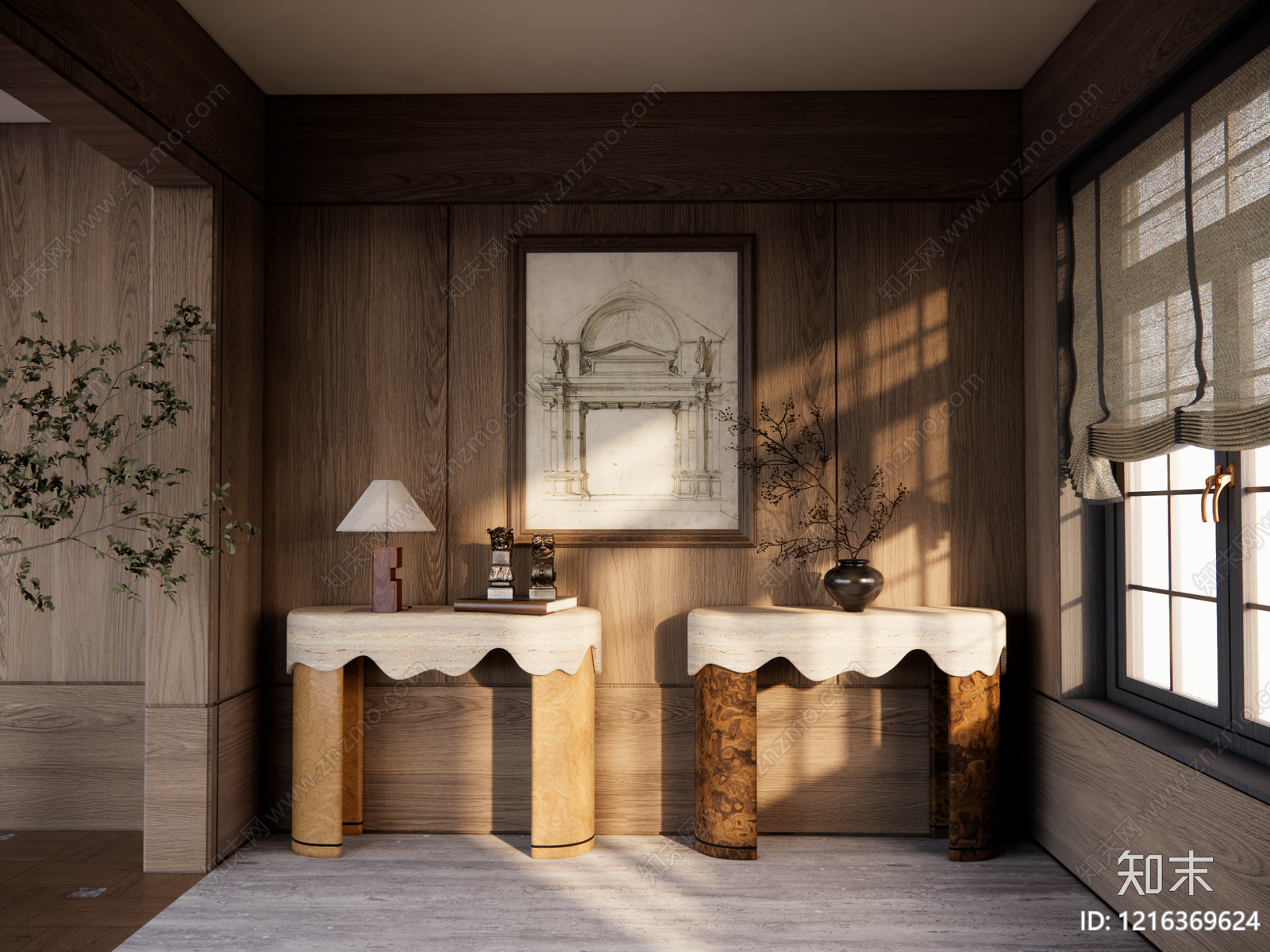 中古风玄关柜 现代中古玄关端几 侘寂中古端几挂画 现代中古盆栽台灯 侘寂中古端几盆栽 现代中古窗帘