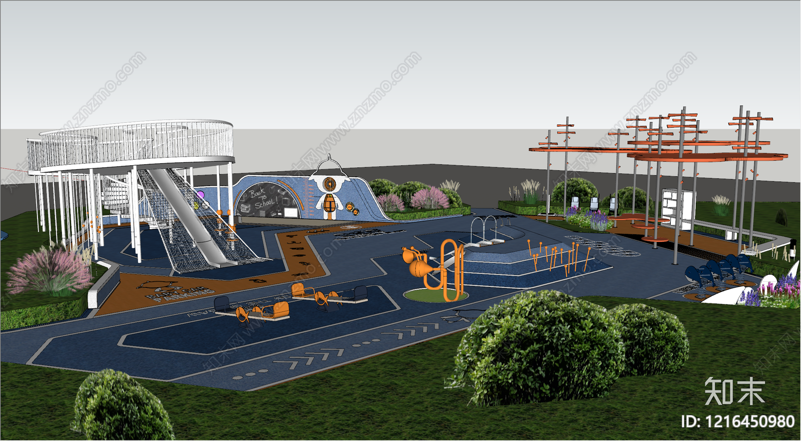 - 现代简约儿童游乐空间 流线儿童活动空间 大象儿童设施 圆形健身廊架设施 游乐器材摇摇乐 儿童篮球场