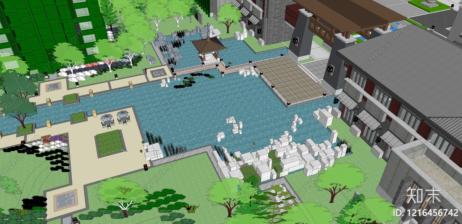 新中式景观小区景观 水景节点 景观节点