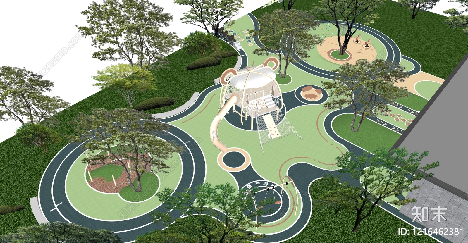- 现代简约儿童游乐空间 流线儿童活动空间 大象儿童设施 圆形健身廊架设施 游乐器材摇摇乐 儿童篮球场