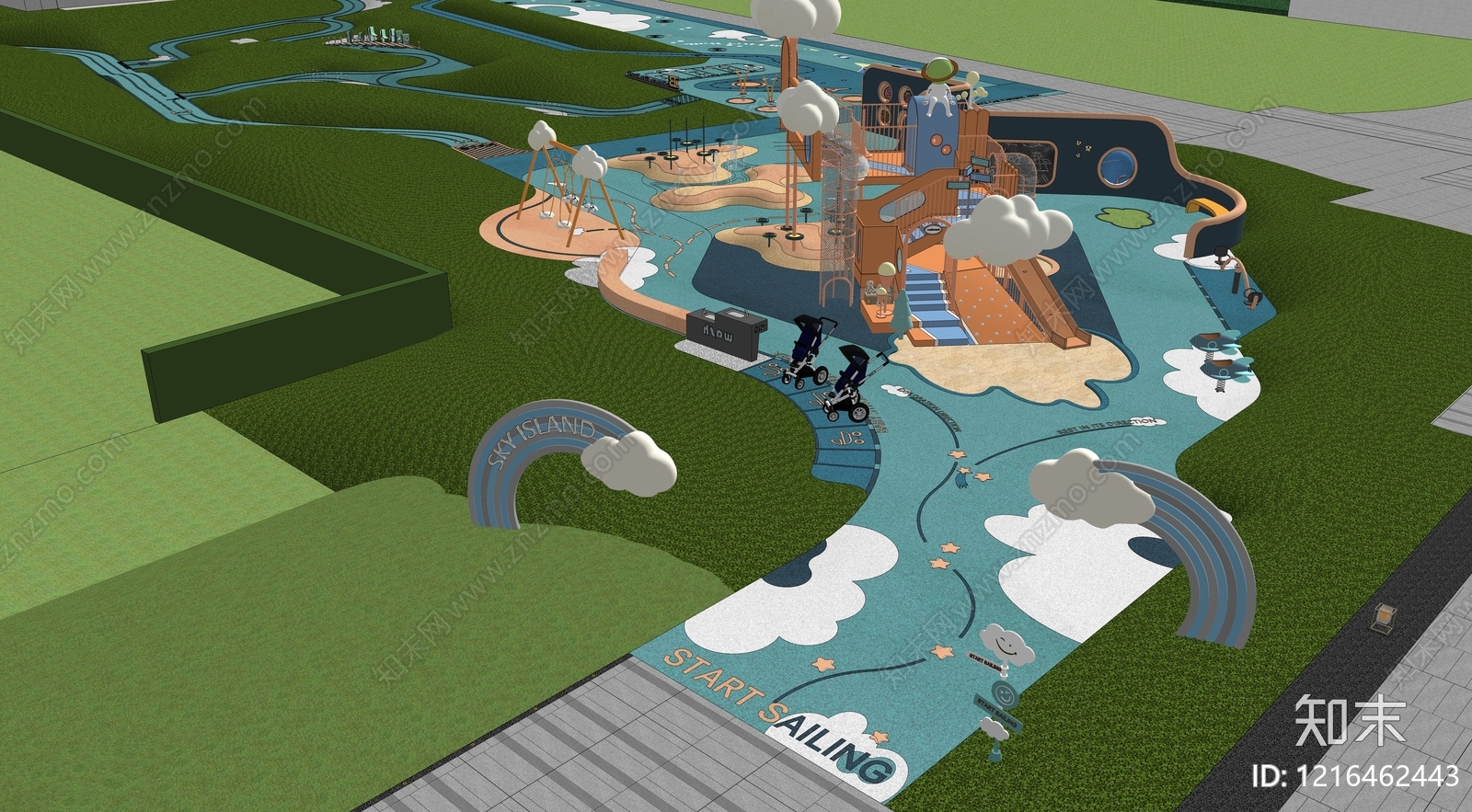 - 现代简约儿童游乐空间 流线儿童活动空间 大象儿童设施 圆形健身廊架设施 游乐器材摇摇乐 儿童篮球场
