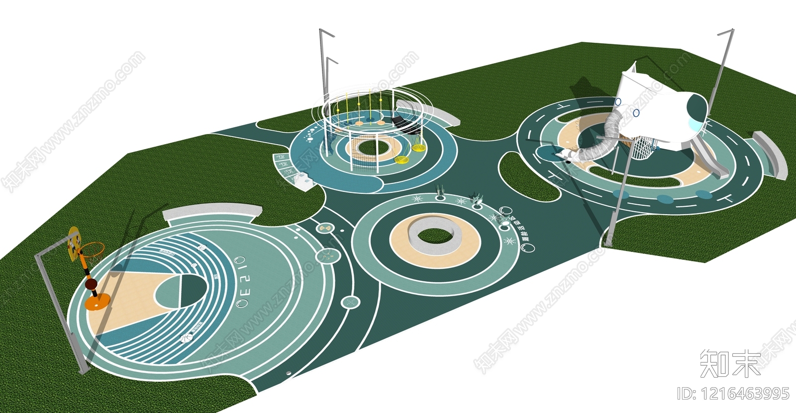 - 现代简约儿童游乐空间 流线儿童活动空间 大象儿童设施 圆形健身廊架设施 游乐器材摇摇乐 儿童篮球场