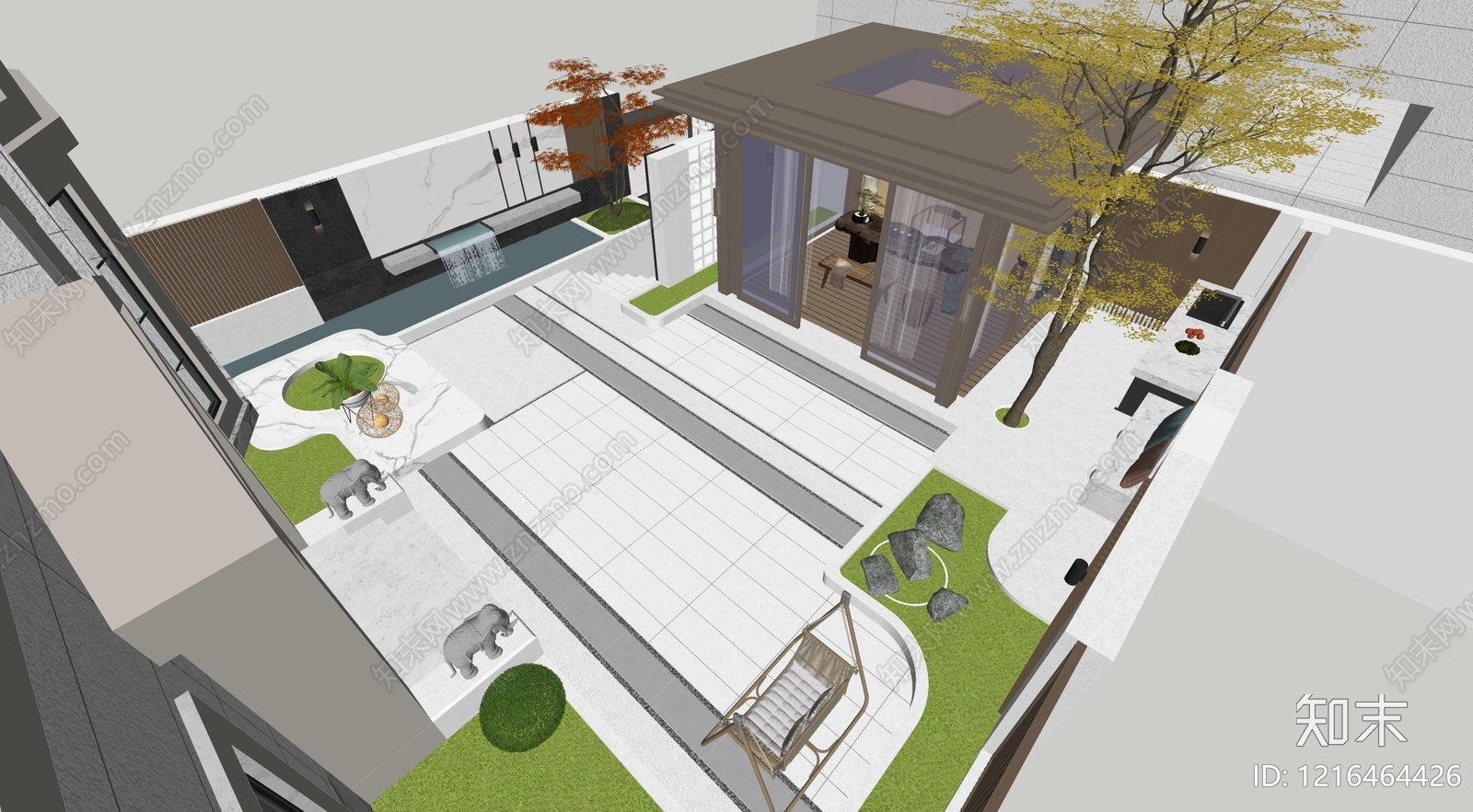 - 新中式景观别墅庭院 中式庭院花园 假山流水 户外秋千 洗手池