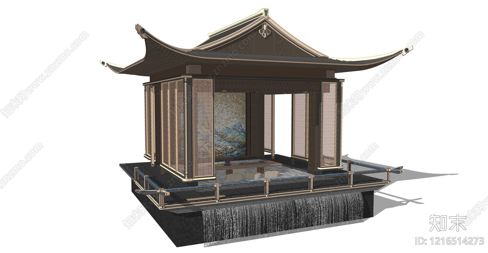 - 新中式小公建 新中式观景茶亭 跌水景亭古建亭 特色格栅矮栏杆 斜屋顶宋式景观亭 浮世绘背景