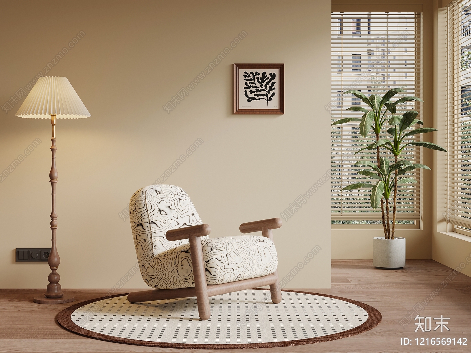 奶油风单人沙发 中古风休闲沙发 单人沙发 休闲椅 落地灯