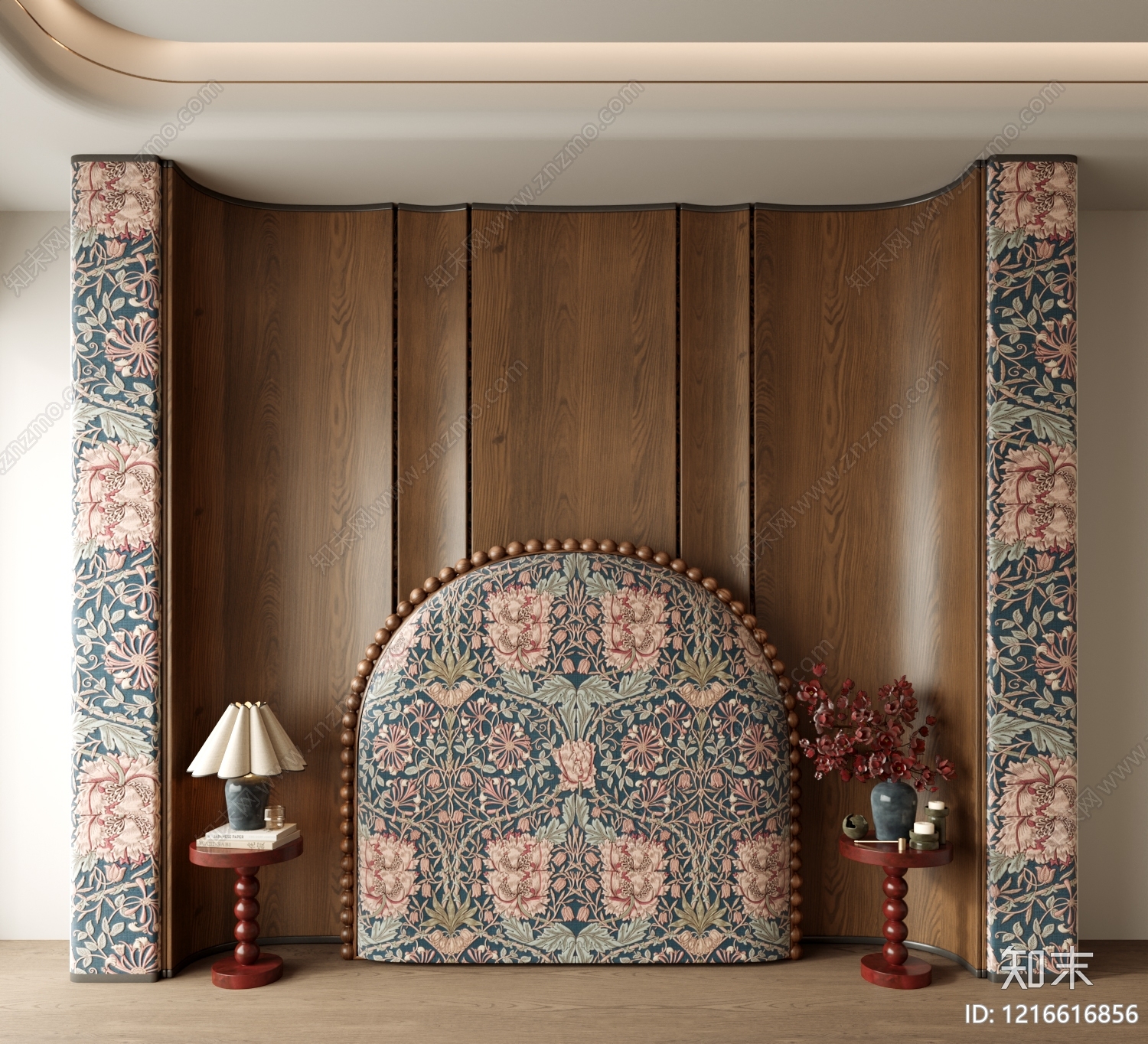 中古风背景墙 床头背景墙 卧室背景墙 床靠背 床头柜 花艺台灯摆件
