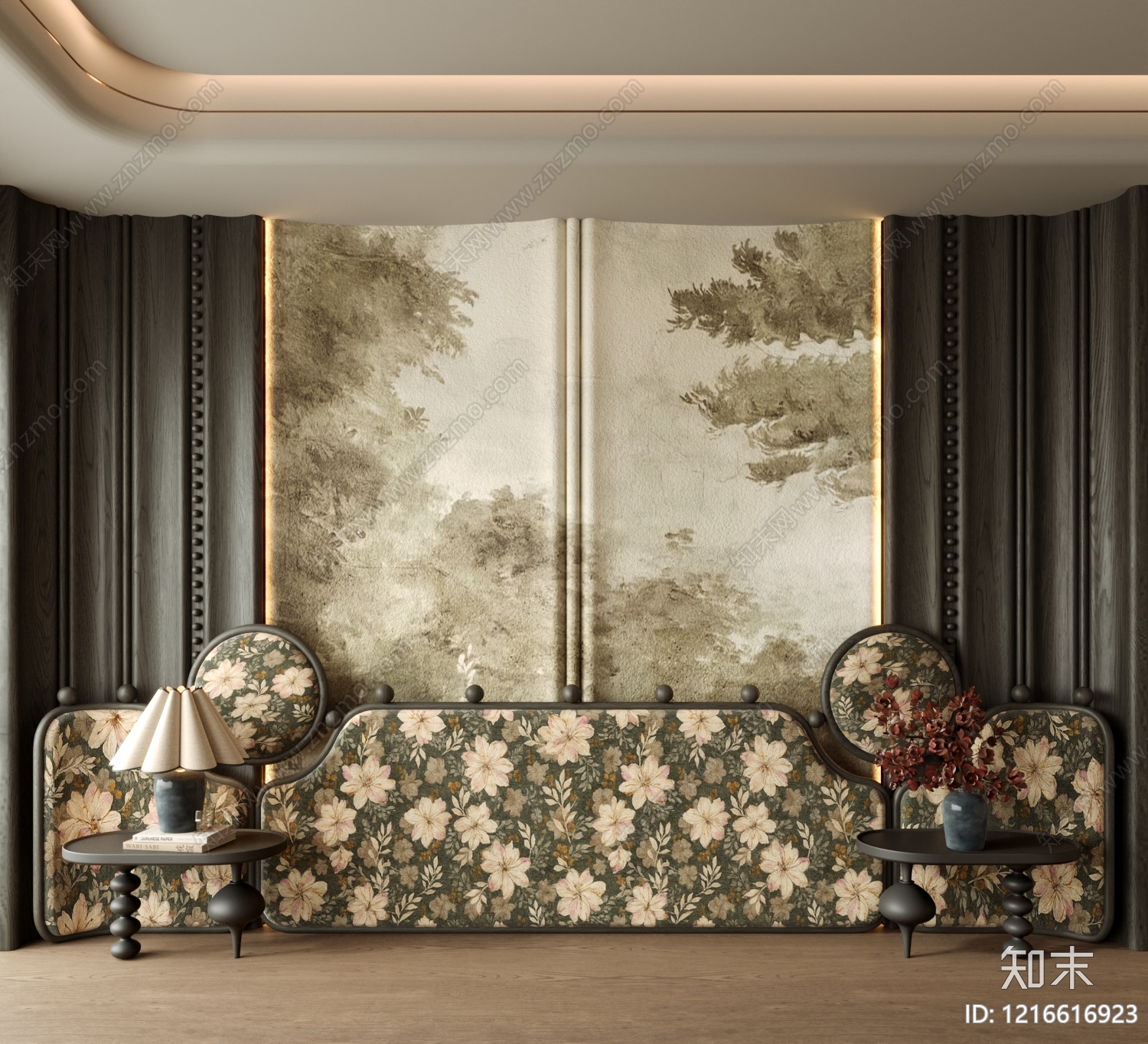 中古风背景墙 中古床头背景墙 法式卧室背景墙 床头柜 台灯 桌面摆件