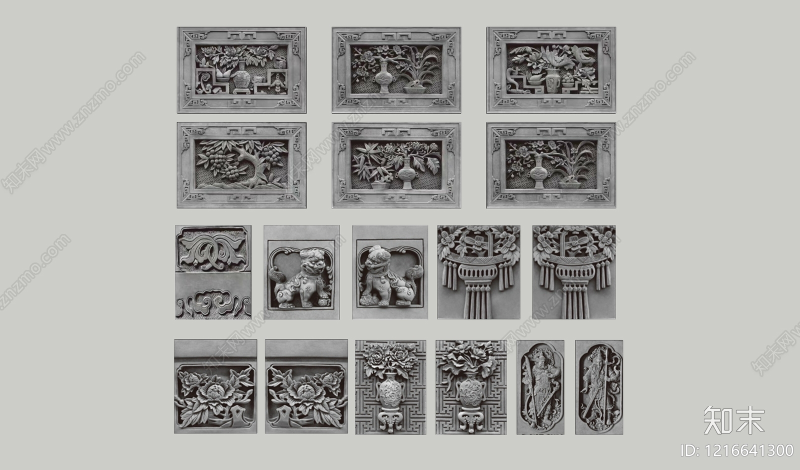- 新中式浮雕 2D砖雕图案 狮子 石材雕花 景墙照壁 砖雕浮雕