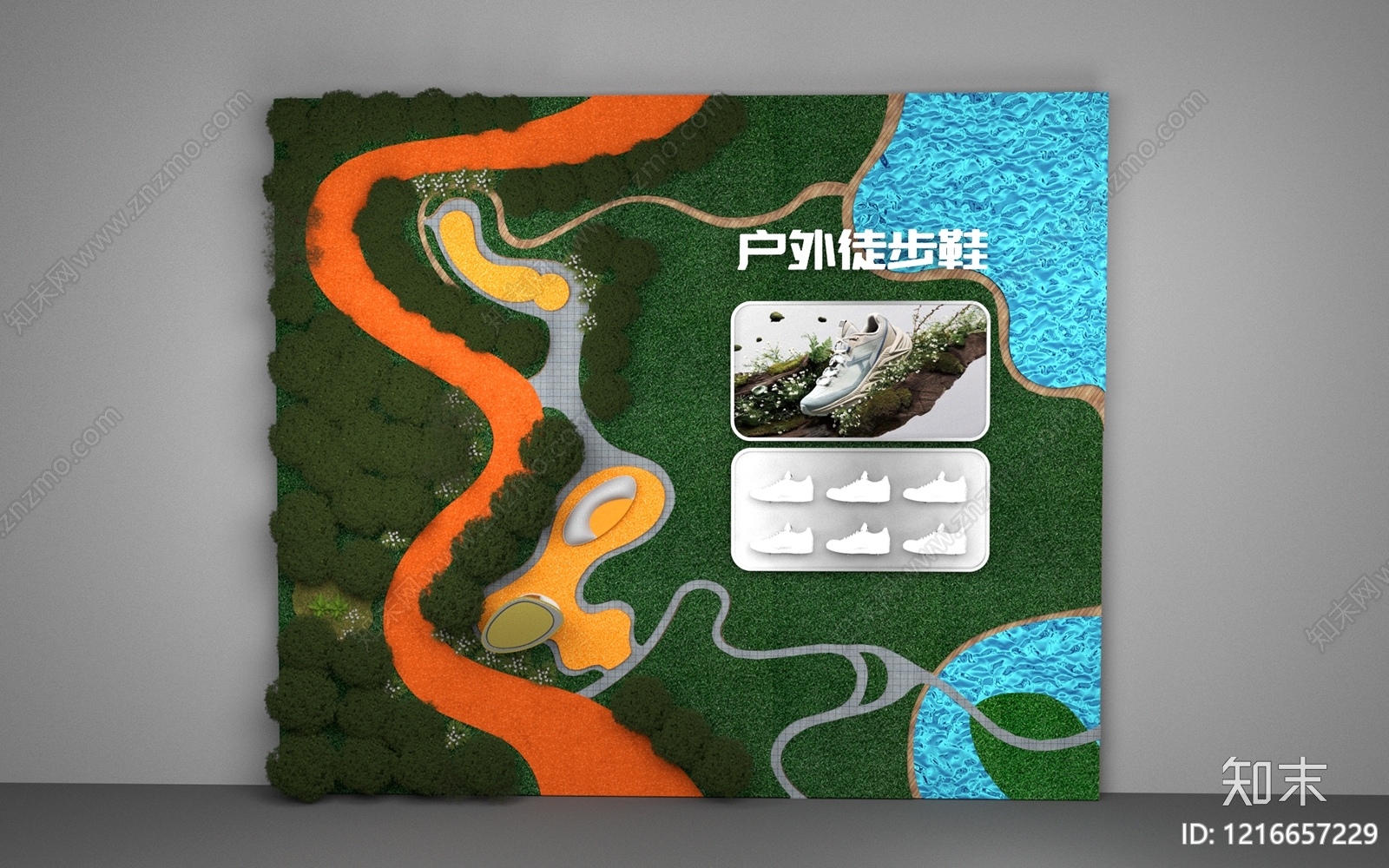 微缩景观风其他美陈 户外主题橱窗 户外休闲鞋美陈 带状公园 公园主题展示墙 树木花草景观