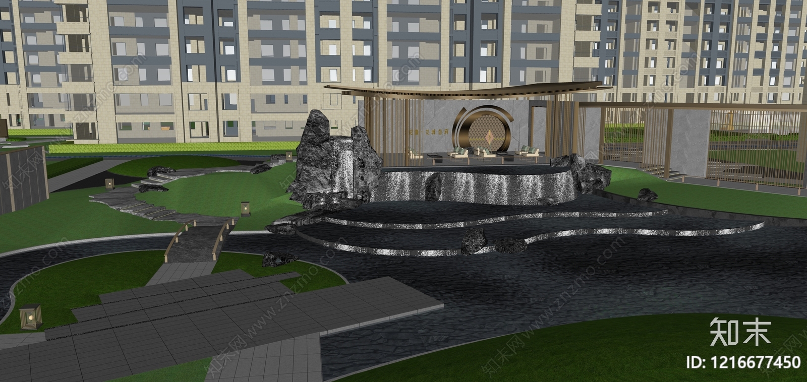 - 新中式小区景观 住宅景观 住宅廊架景观 住宅跌水景观 住宅跌水 住宅跌水假山