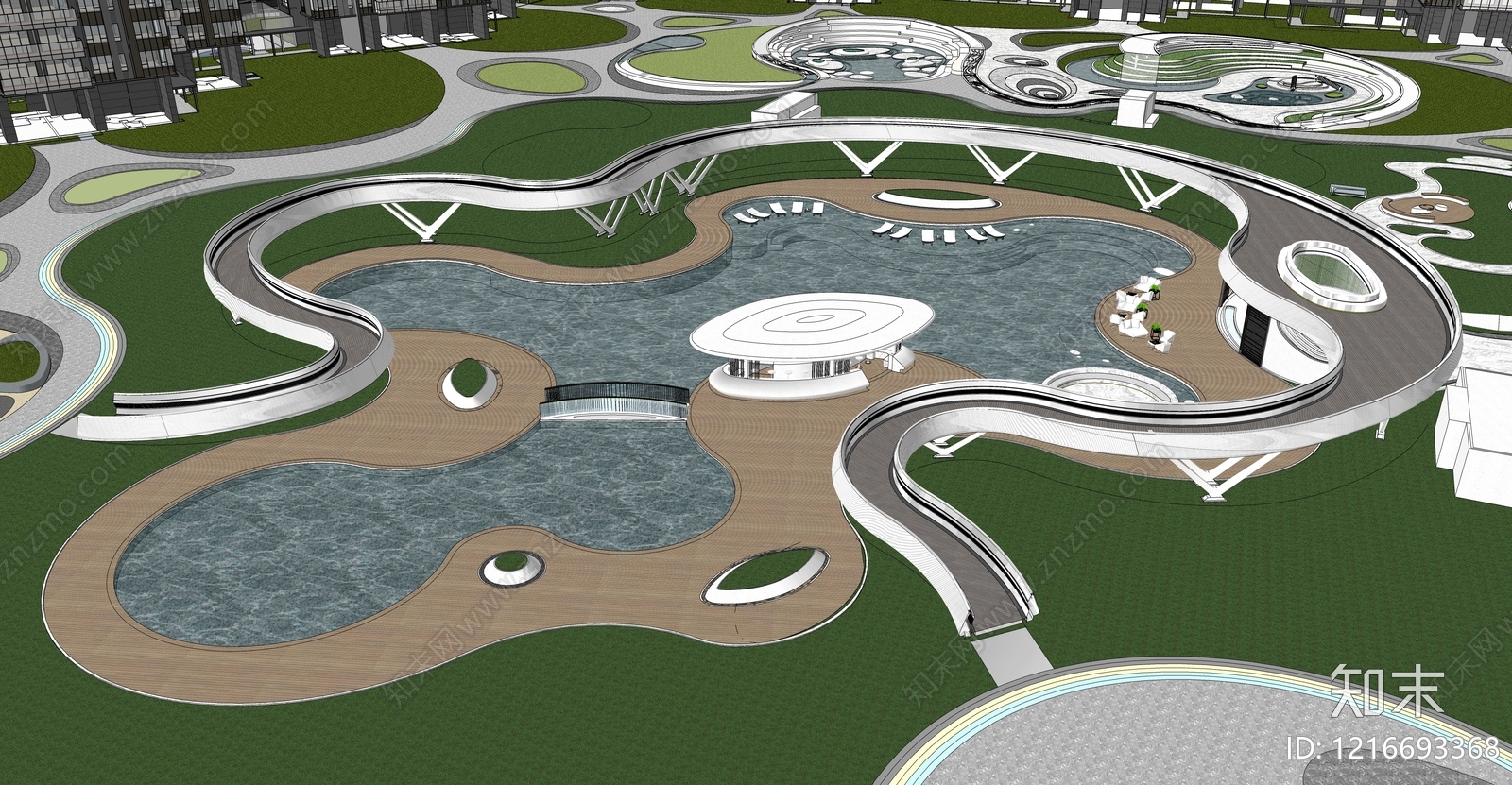- 现代小区景观 曲线景观 大区景观中心水景 曲线飘桥栈道廊架 泳池会客厅 儿童戏水池
