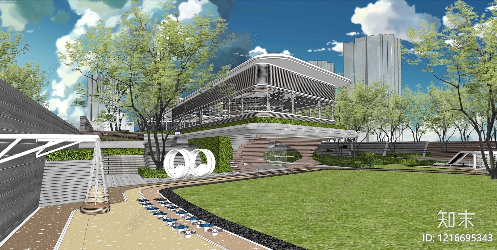 - 现代小区景观 示范区 折线景观廊架 廊架会客厅水幕墙 鲸鱼雕塑鸟笼廊架 入口水景销售中心
