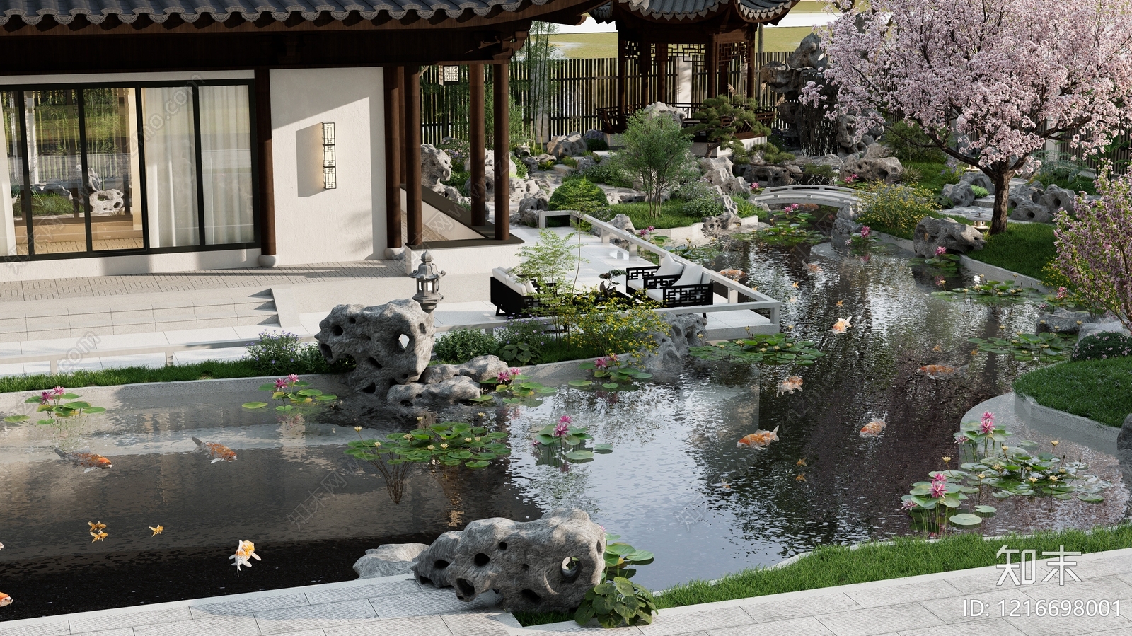 新中式景观别墅庭院 中式 花园 假山鱼池 景观 庭院