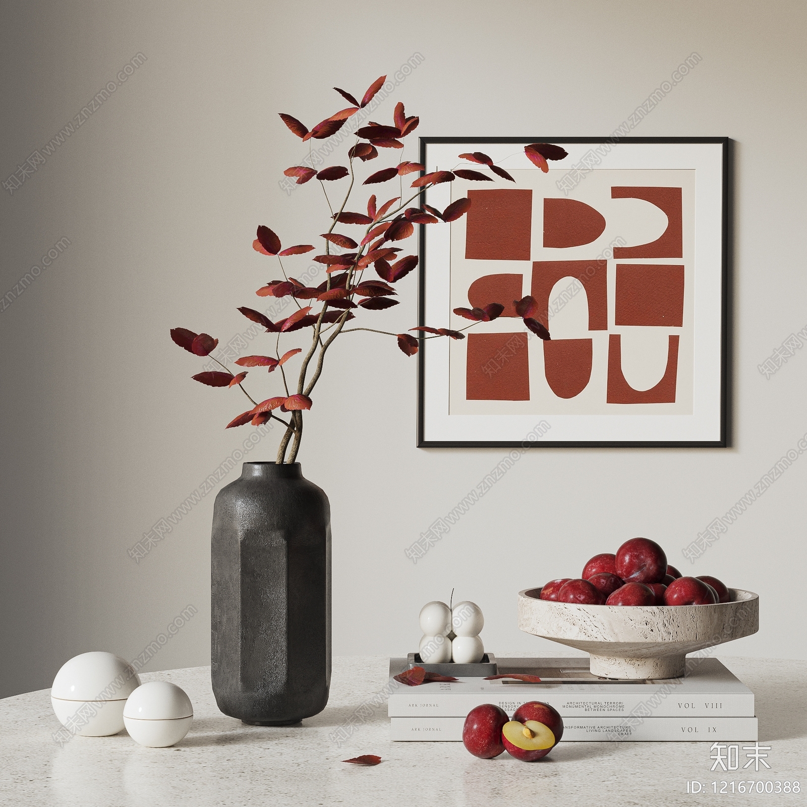 现代摆件组合 陶瓷花瓶 果盘 书籍 抽象挂画 餐桌摆件