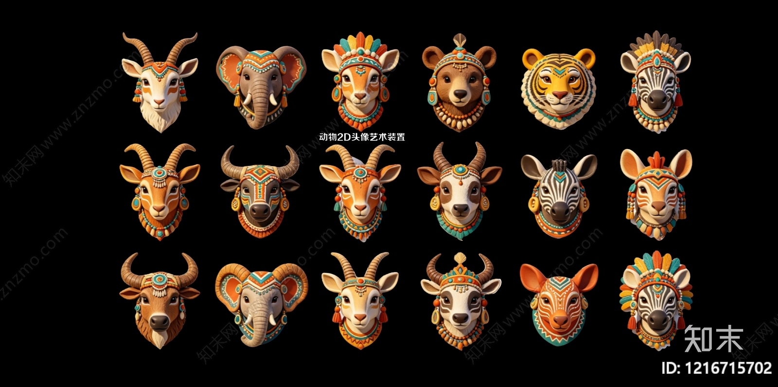 民族风卡通艺术装置 动物2D头像艺术
