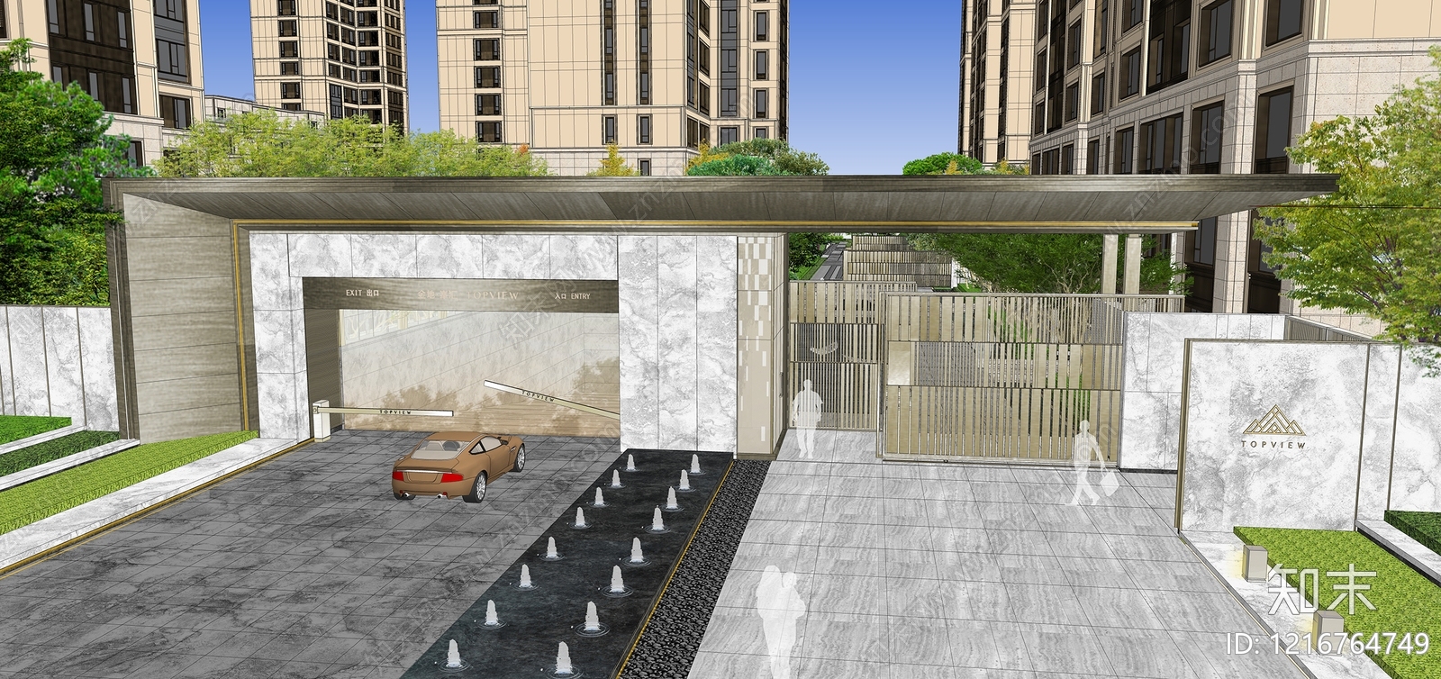 - 现代极简入口大门 住宅景观 住宅弧形景墙 住宅水景 住宅跌水景观 住宅地形景观