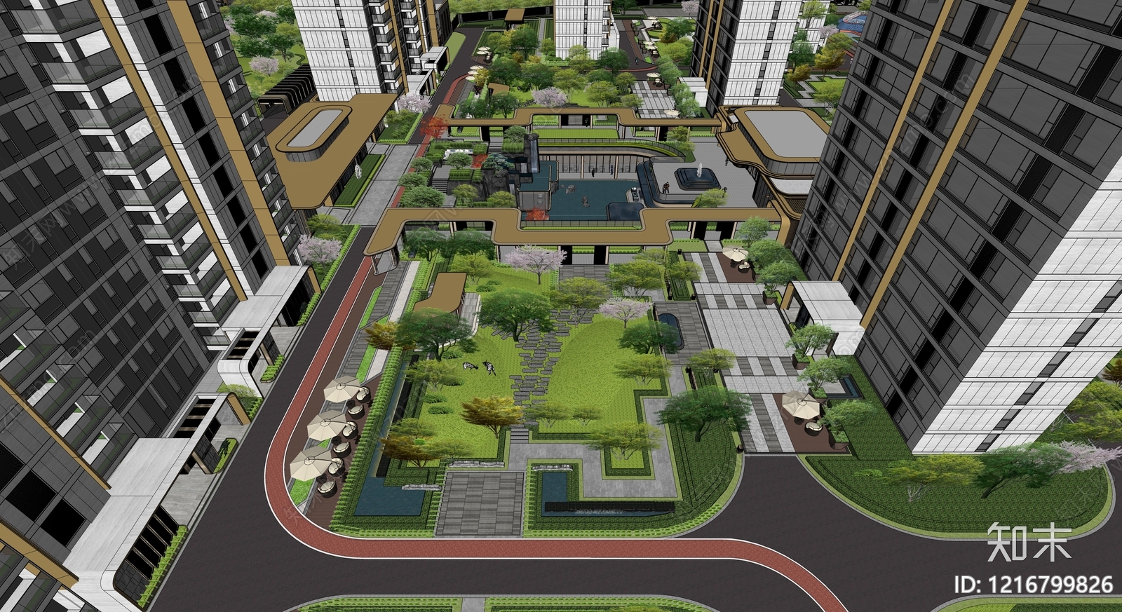 - 现代小区景观 曲线景观 大区景观中心水景 曲线飘桥栈道廊架 泳池会客厅 儿童戏水池