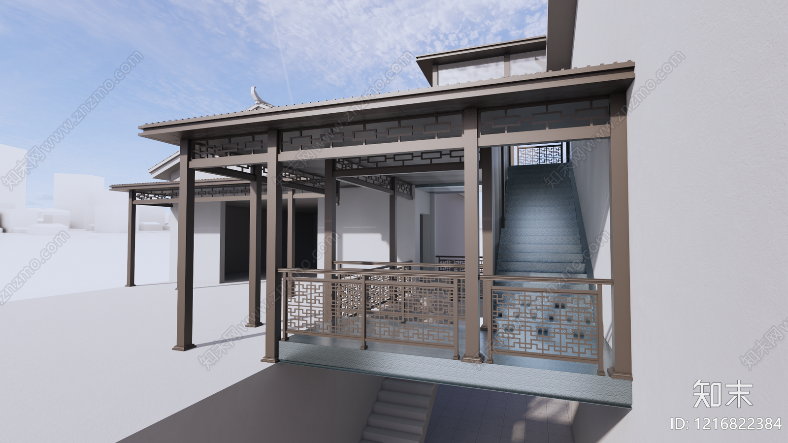 - 新中式廊架 长廊 亭子 雕花栏杆 楼梯 乡村小院