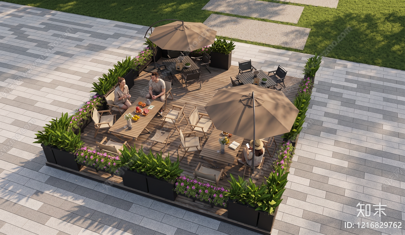 - 现代休憩花园 户外休闲区 户外餐桌椅 遮阳伞花箱