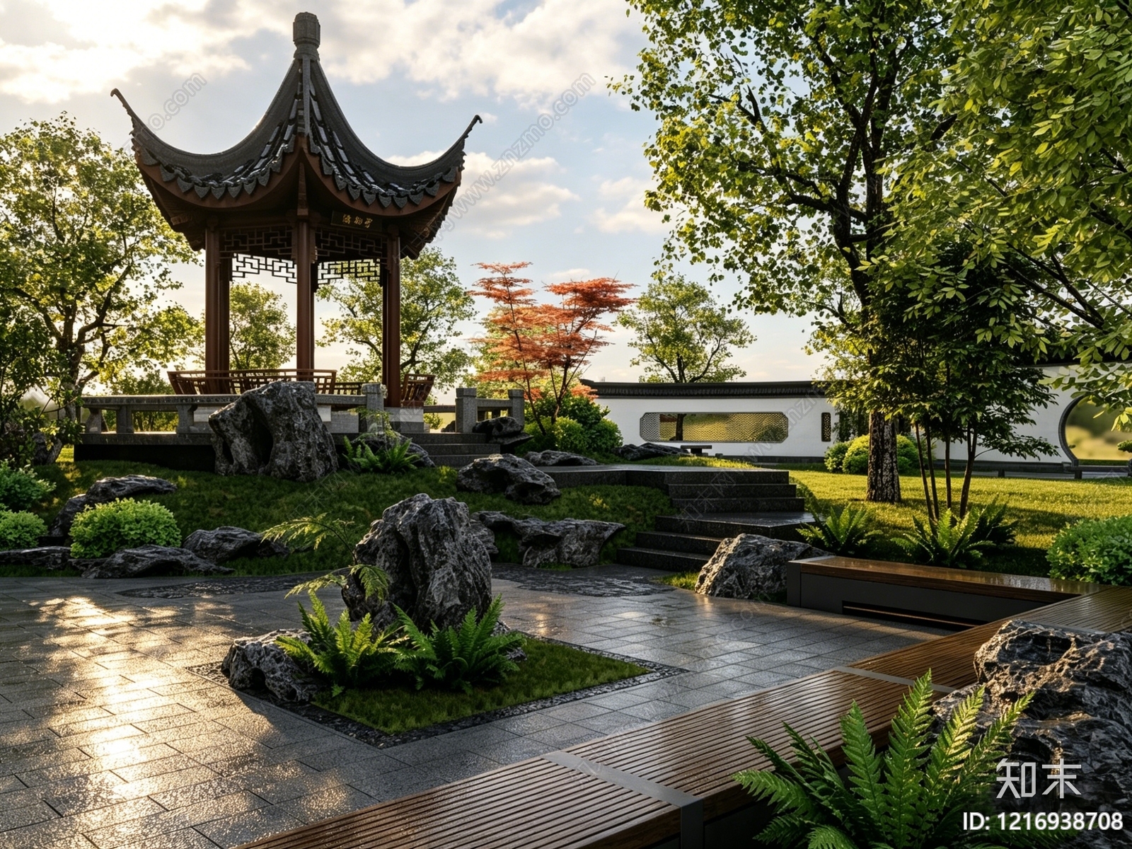 - 新中式亭子 新中式观景亭 斜屋顶特色格栅 挂帘文化铺装 梅花纹