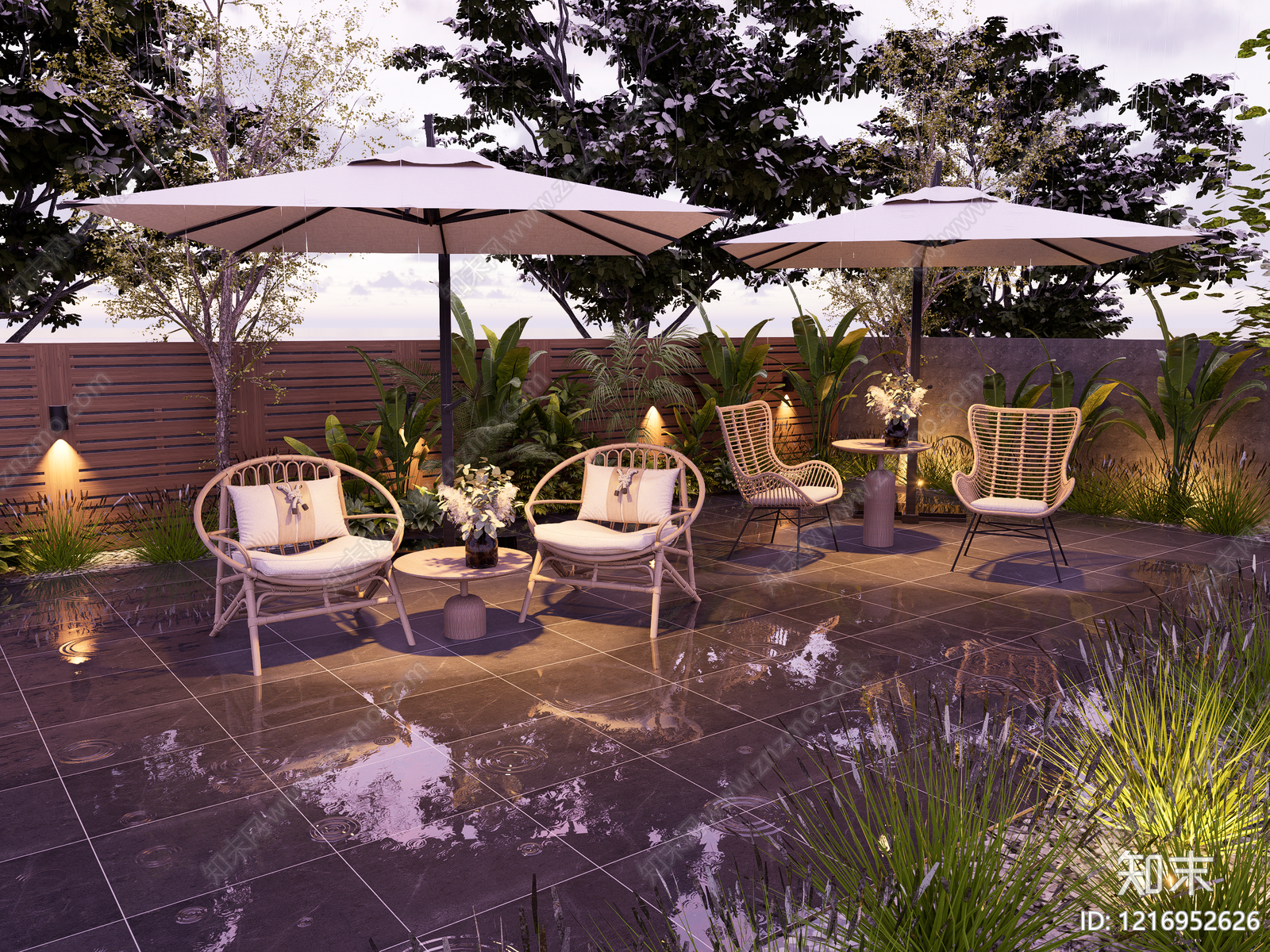 - 现代简约休憩花园 现代田园自然轻奢 私宅庭院阳台露台 桌椅阳伞木围栏 藤编原木塑木金属 休闲度假餐饮茶座