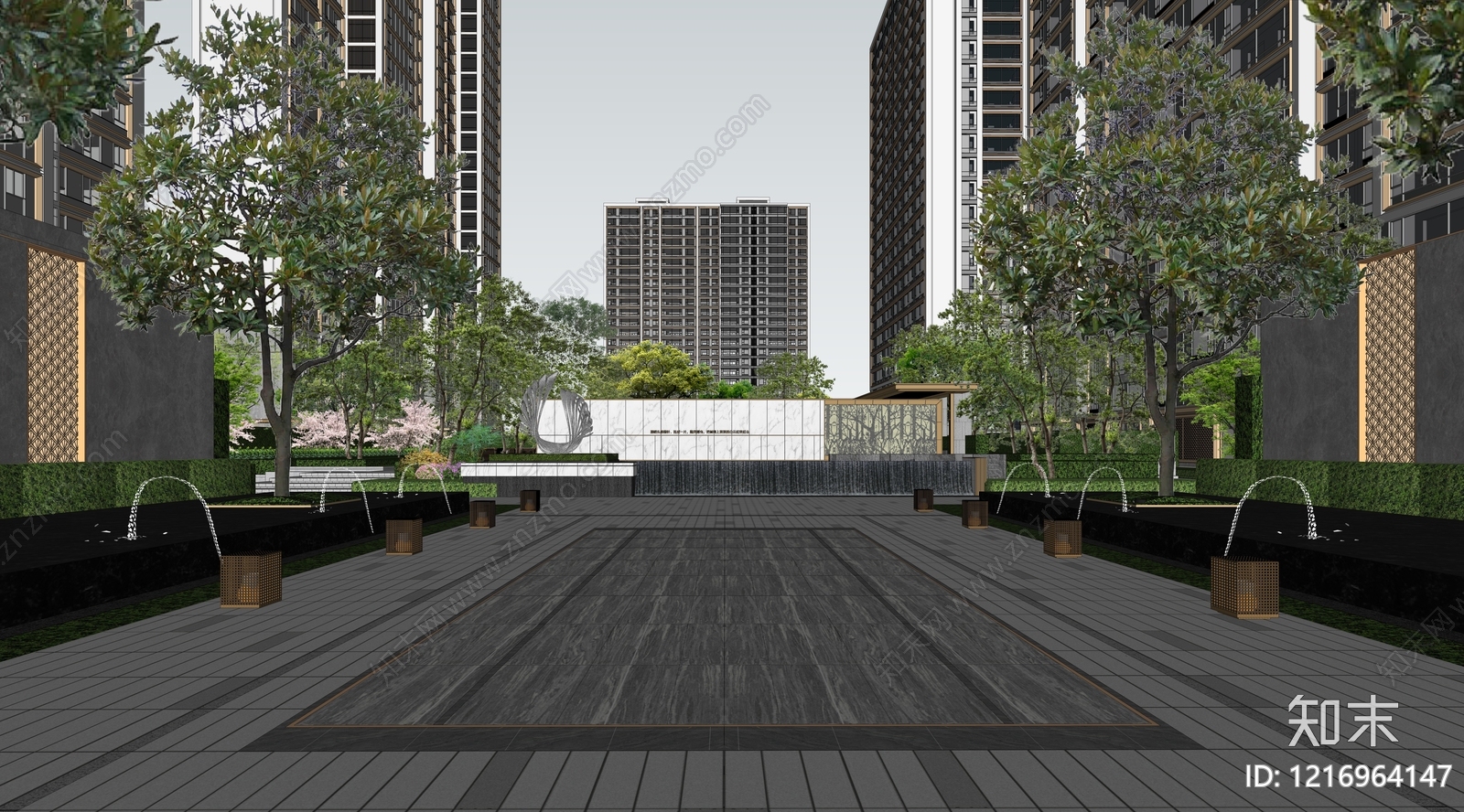 - 现代简约小区景观 轻奢小区中轴景观 新中式流水景墙 新中式小区景观 小区入口对景景墙